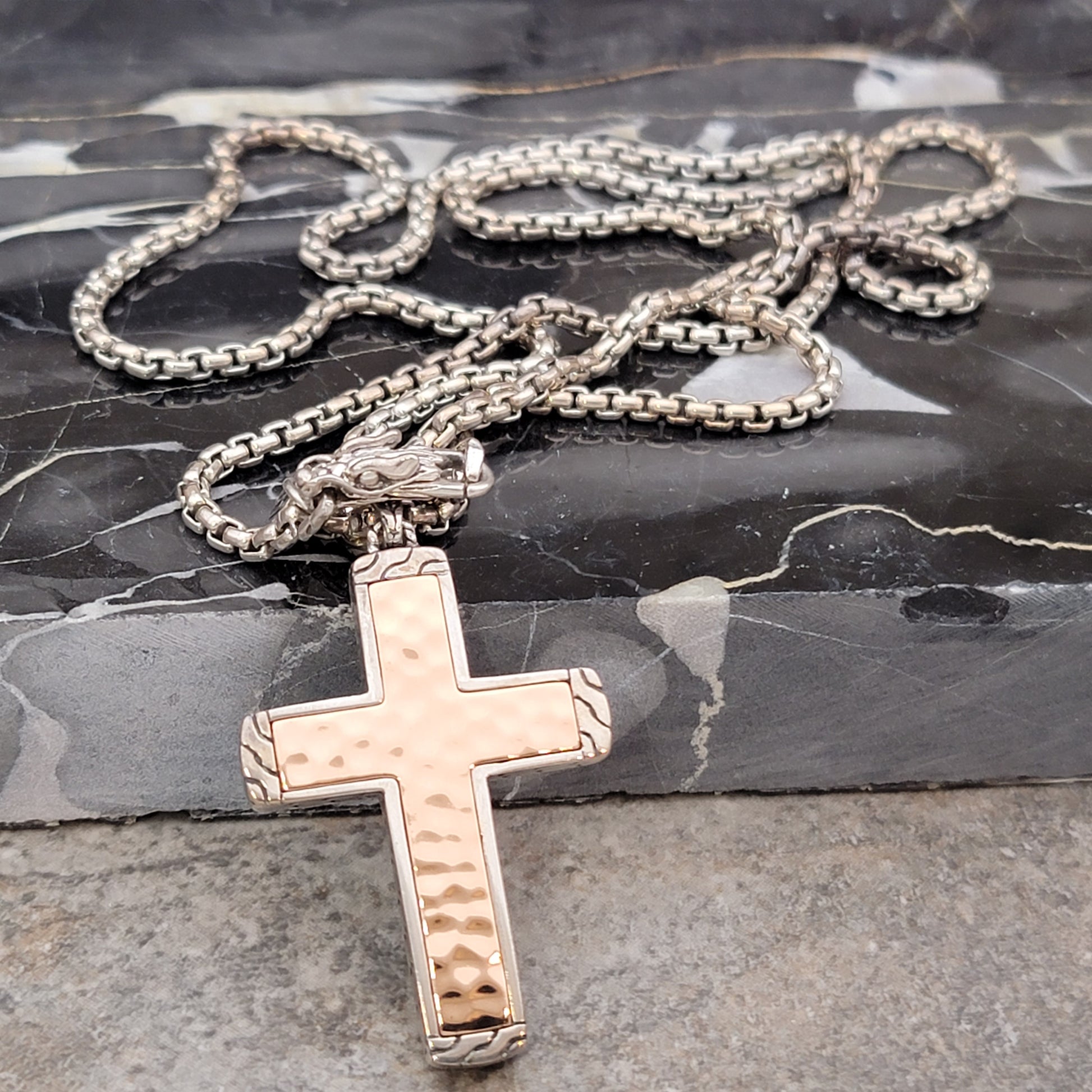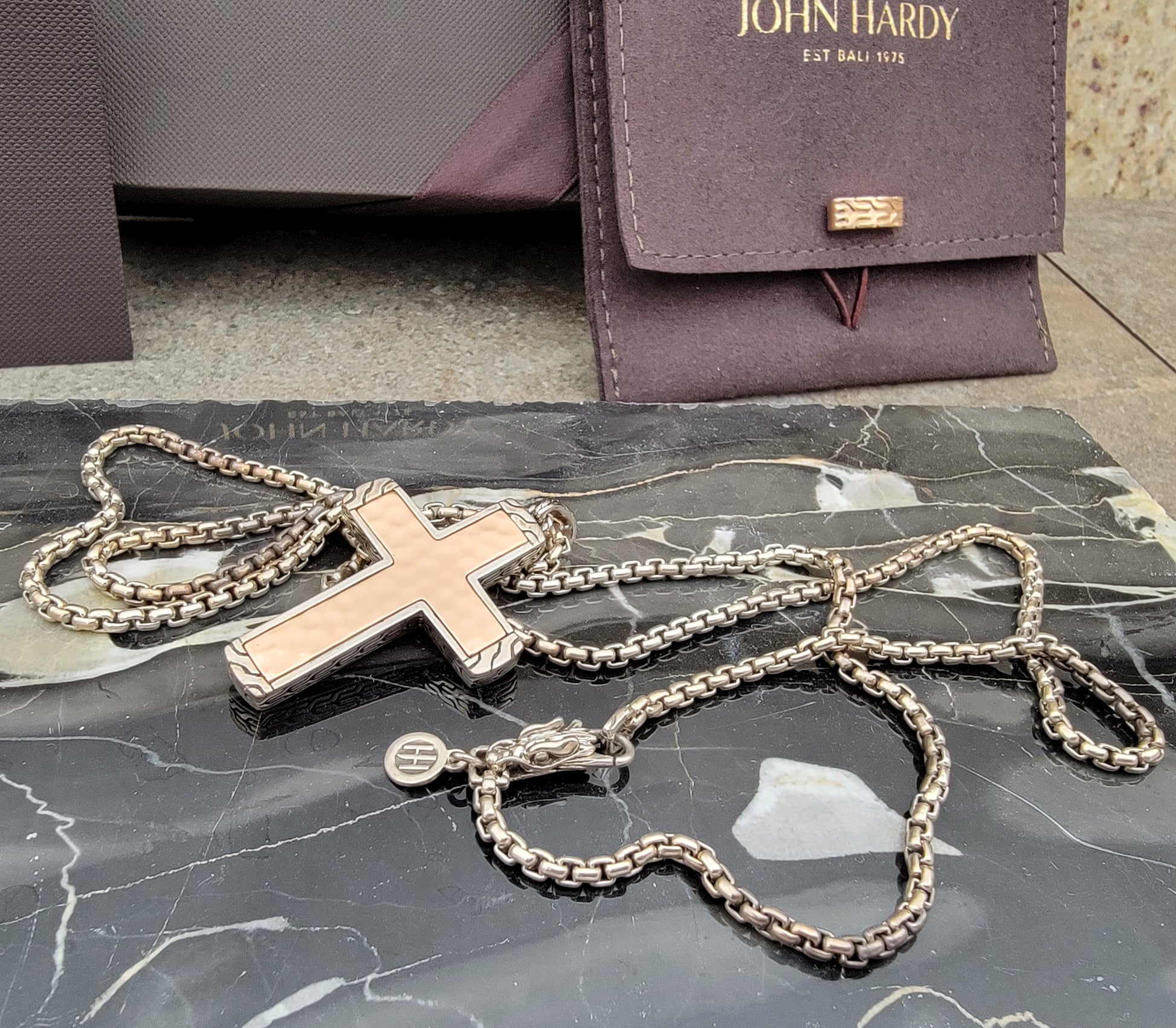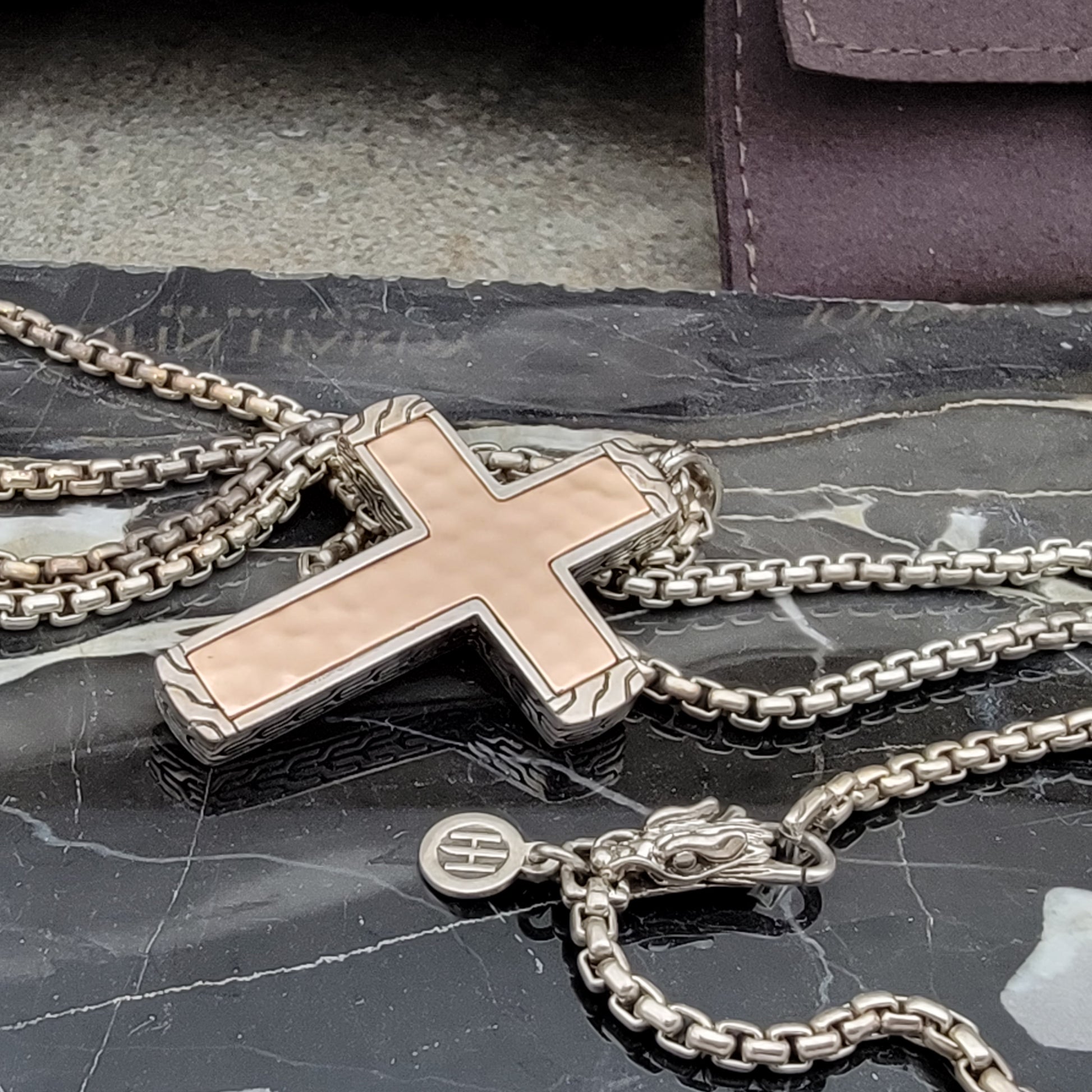 New John Hardy Men's Classic Chain 26" 925 Sterling Silver Necklace Cross with Hammered Bronze. This beautiful John Hardy Men's necklace features a 925 Cross inlaid with Hammered Bronze. The Necklace is 26" Sterling Silver and features the Naga Dragon clasp. This item is New, Never Used, with Box. Sold out and super rare!