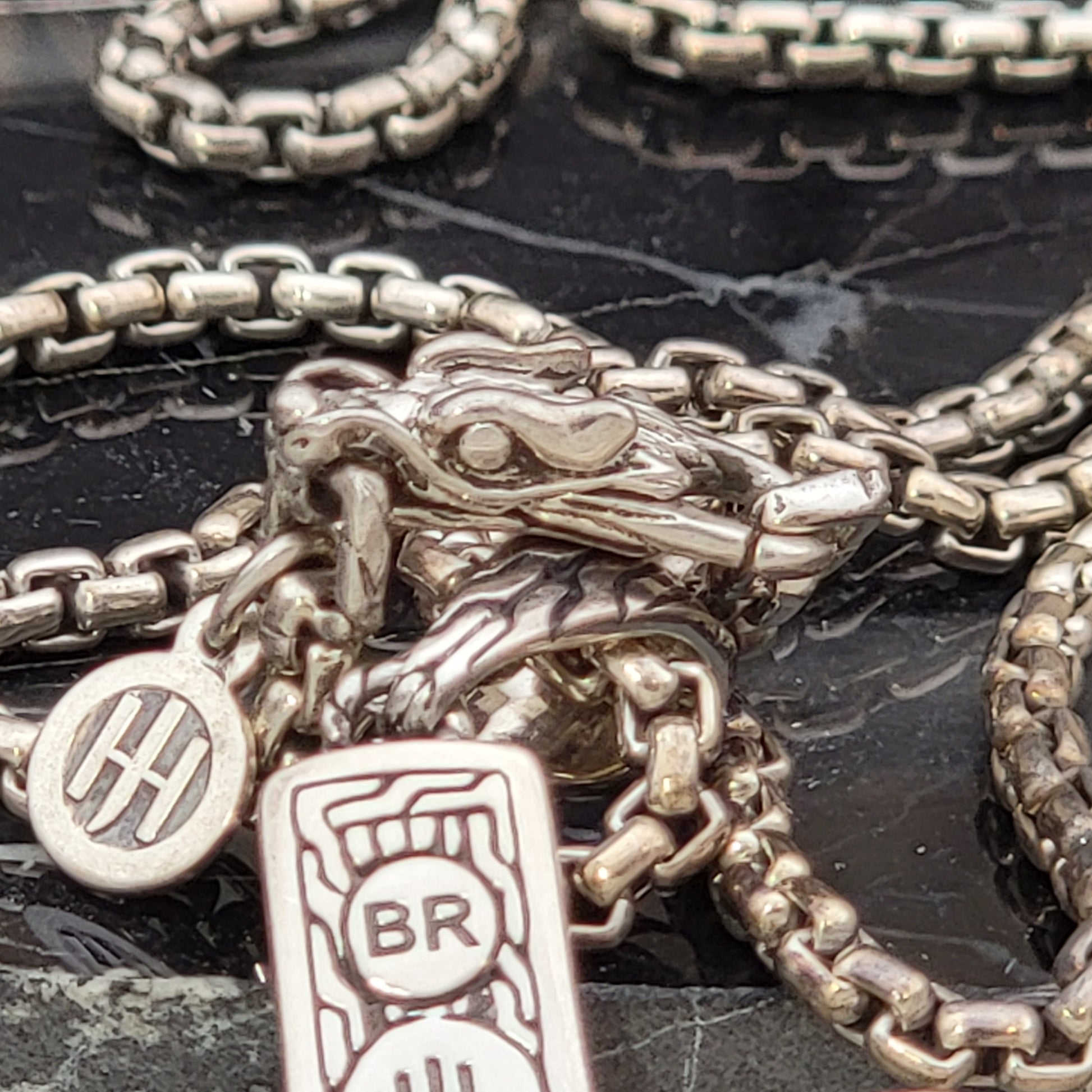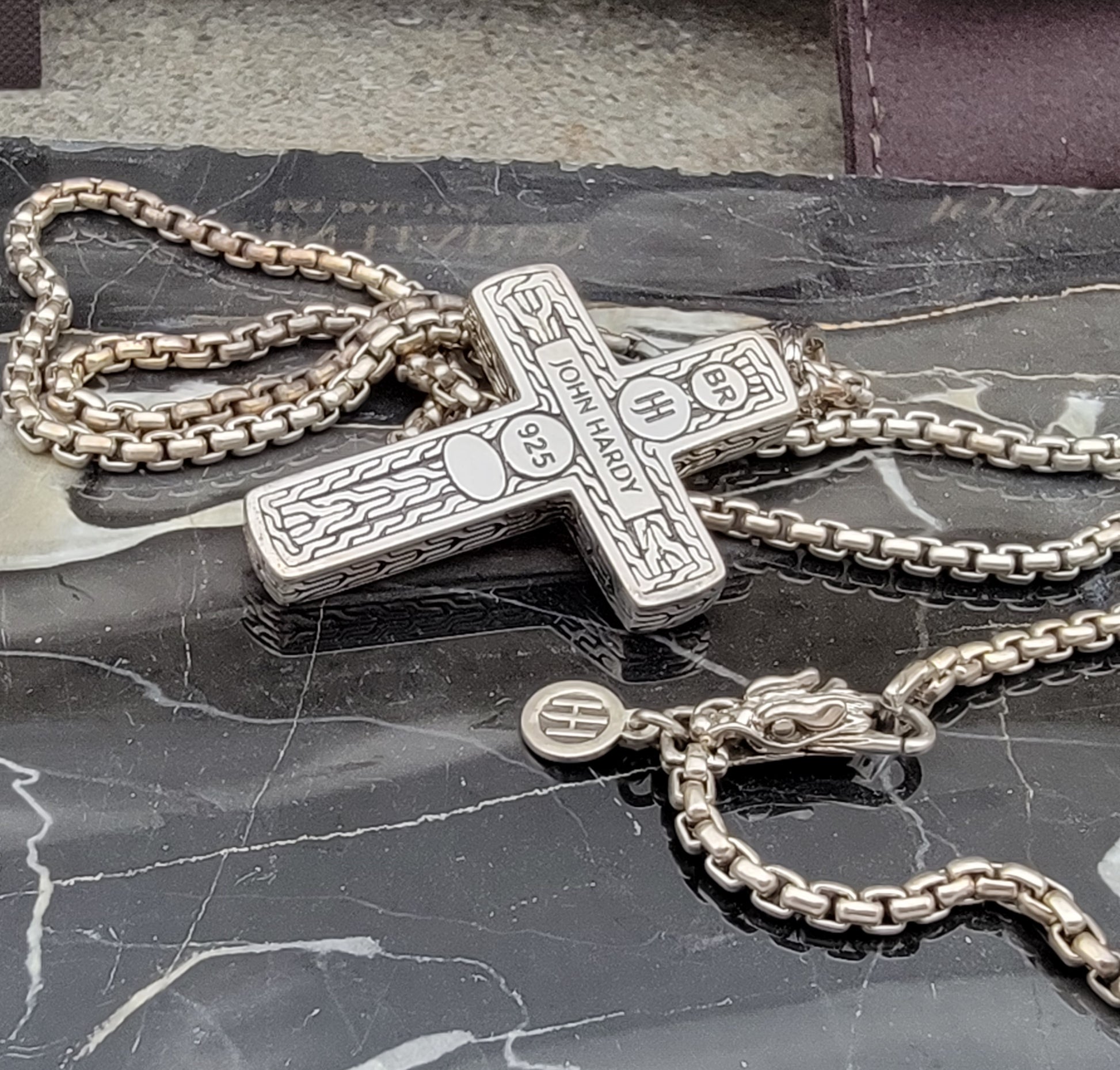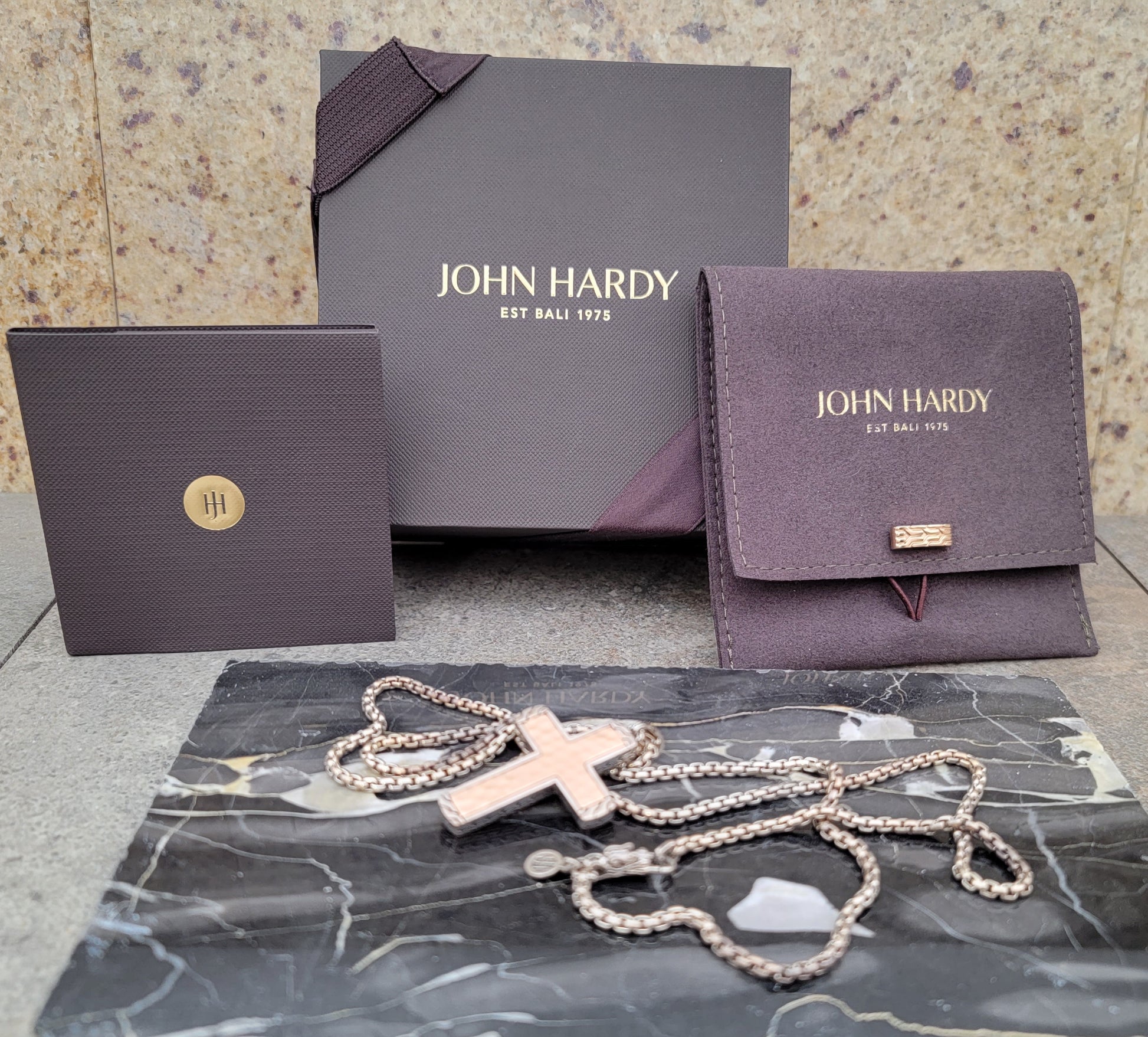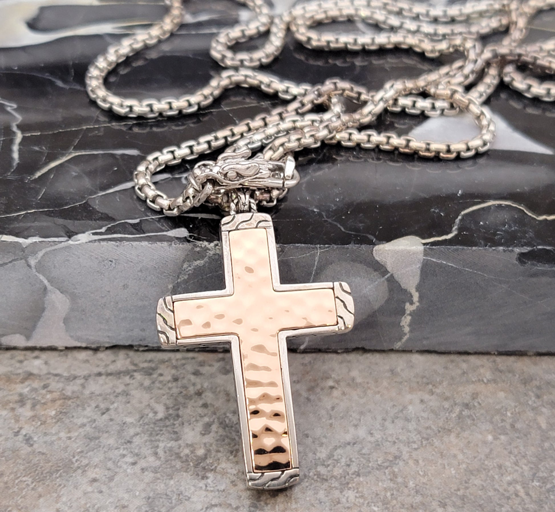 New John Hardy Men's Classic Chain 26" 925 Sterling Silver Necklace Cross with Hammered Bronze. This beautiful John Hardy Men's necklace features a 925 Cross inlaid with Hammered Bronze. The Necklace is 26" Sterling Silver and features the Naga Dragon clasp. This item is New, Never Used, with Box. Sold out and super rare!