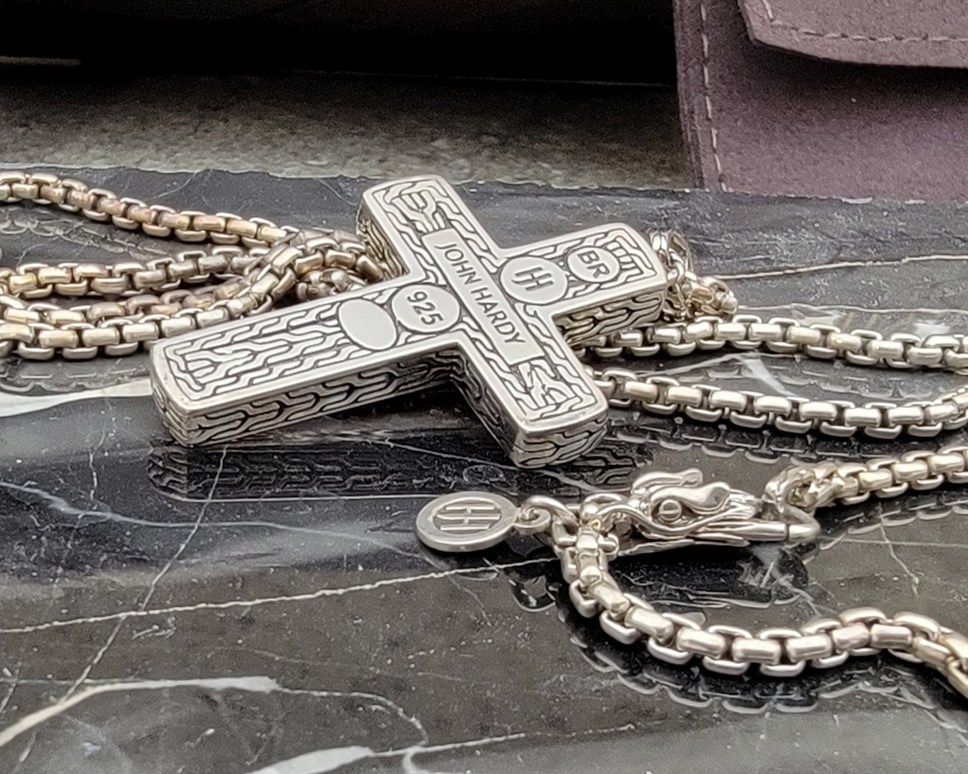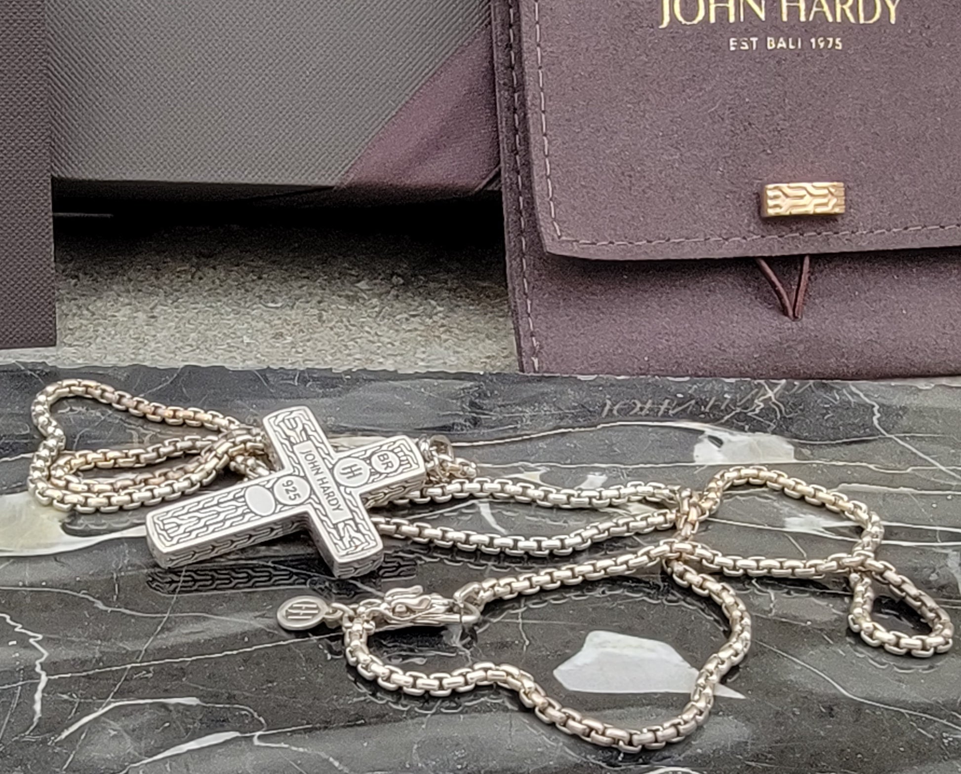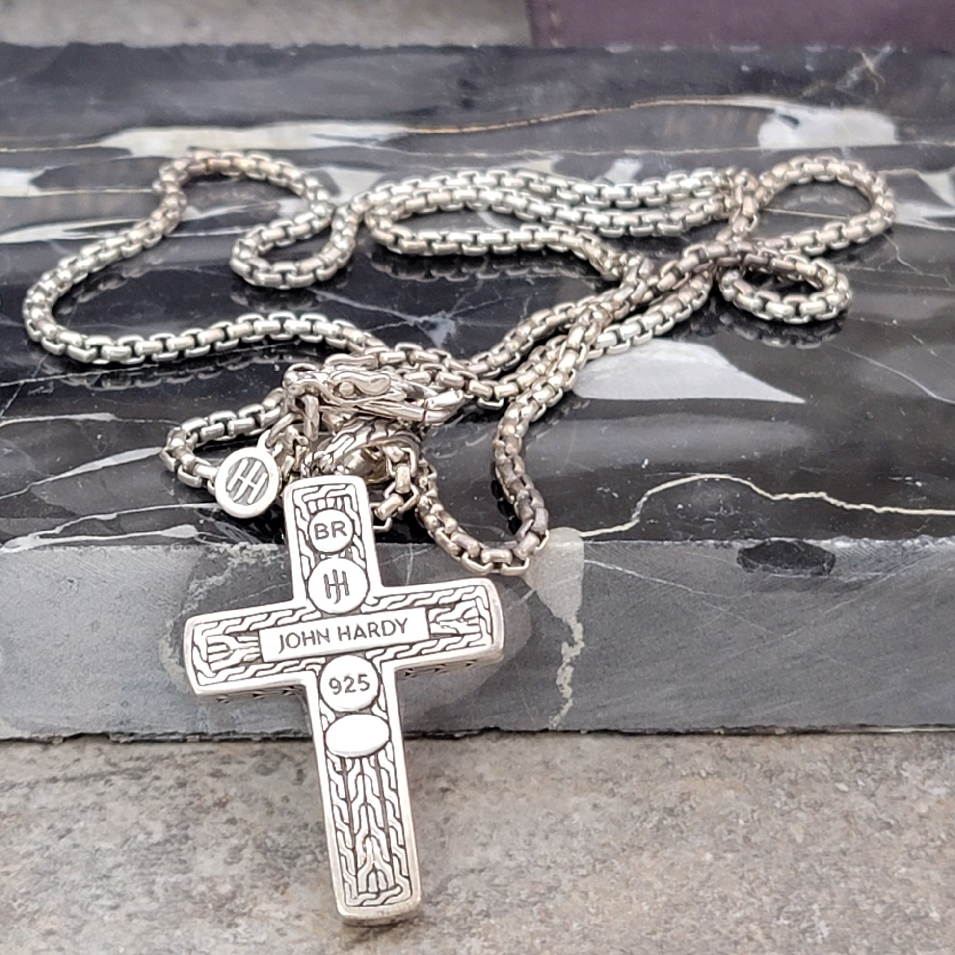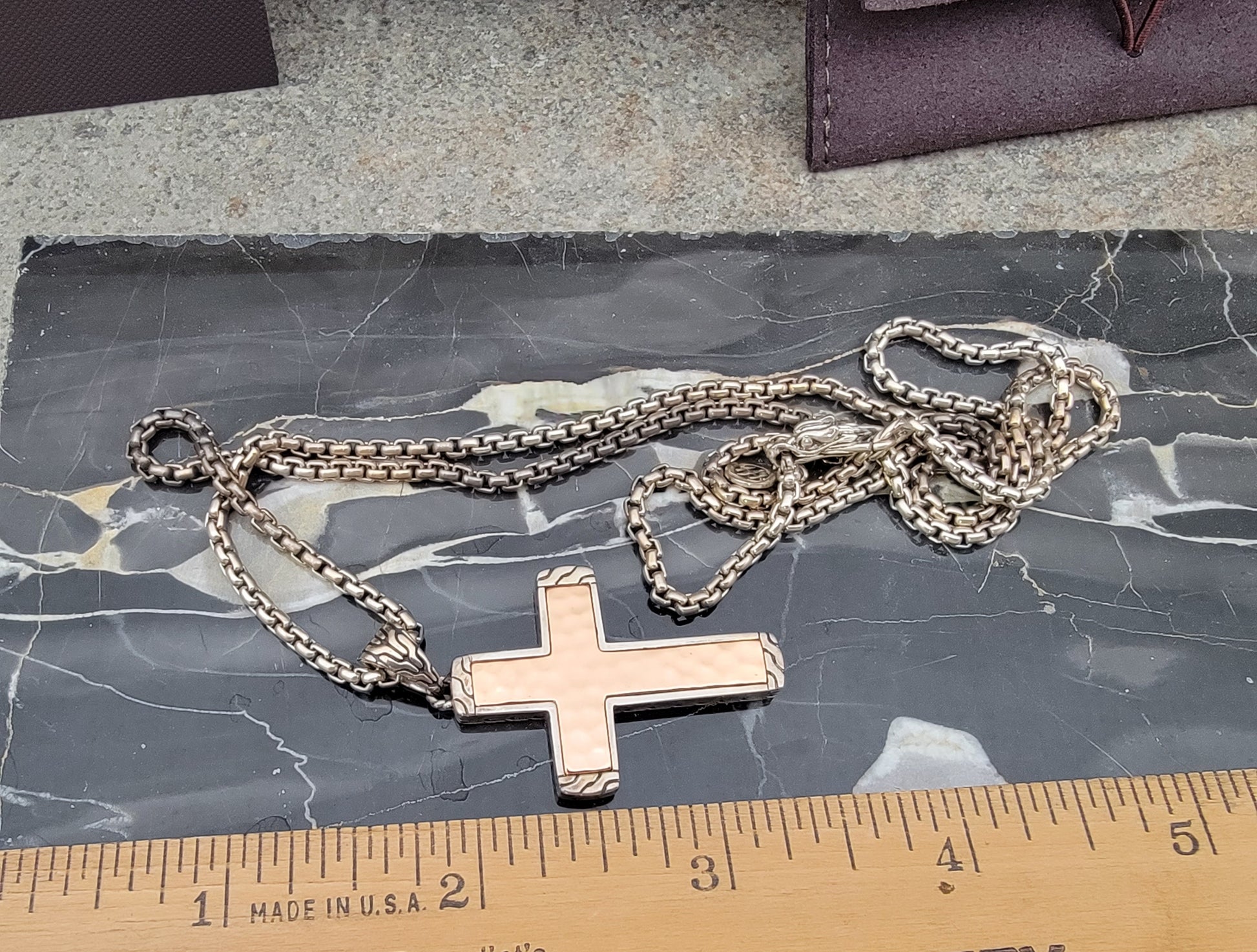 New John Hardy Men's Classic Chain 26" 925 Sterling Silver Necklace Cross and Hammered Bronze